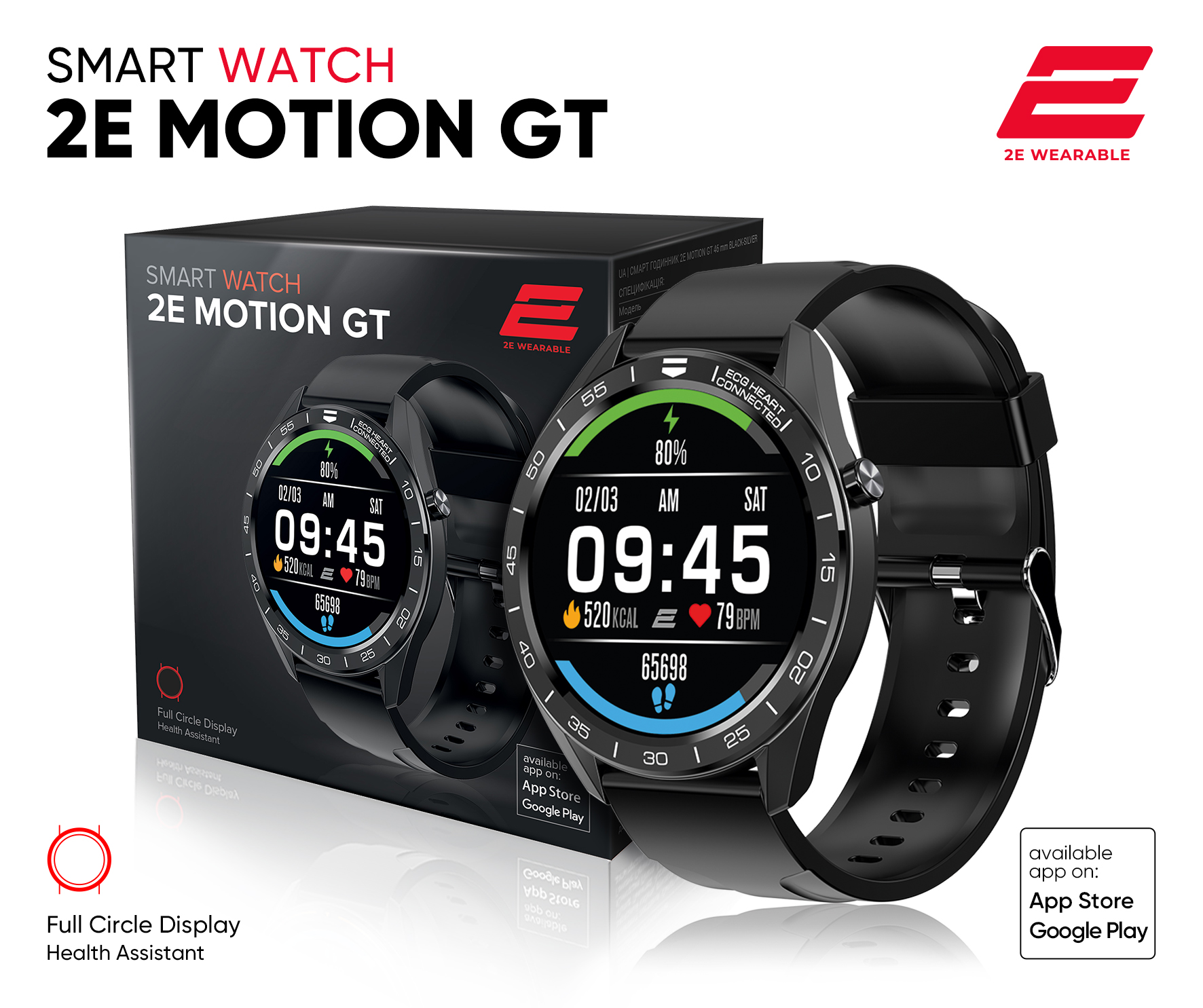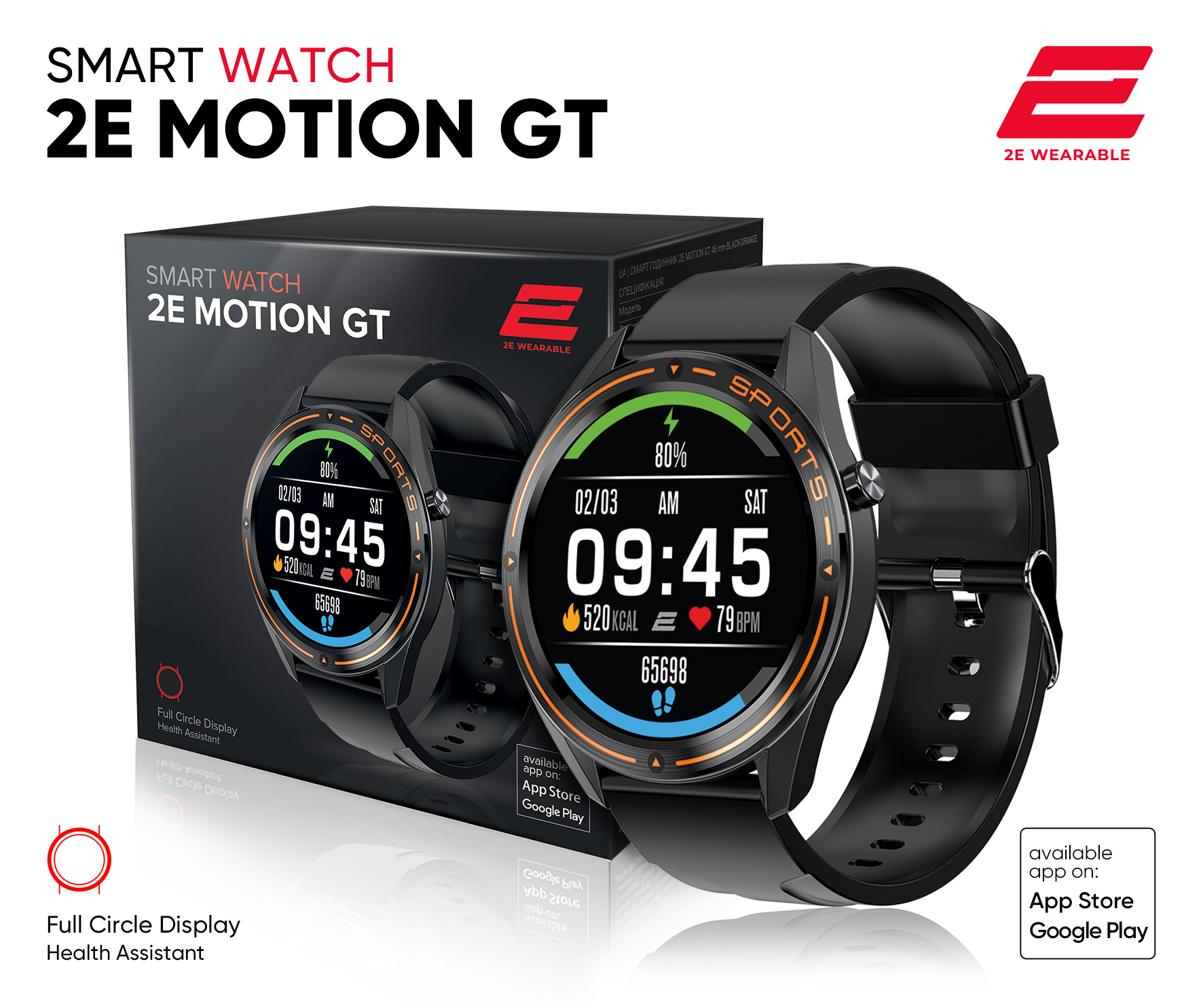 Stay on the move and reach new heights with the 2E Motion GT 46 mm smartwatch. Many sports functions, a large round bright display, a thin and light body with moisture protection — this is your personal assistant during sports and more.