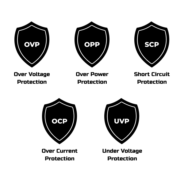 Overcurrent protection (OCP), undervoltage protection (UVP), overvoltage protection (OVP), overload protection across all channels (OPP), short-circuit protection (SCP).