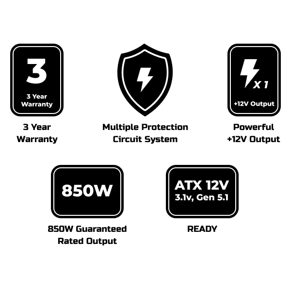 Supports a wide range of PC components. Minimal output voltage fluctuation. 12 V DC for stable system operation. Input voltage range – 200-240 V AC.