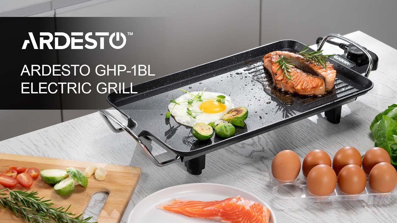 ARDESTO GHP-1BL tabletop electric grill turns any kitchen into a real barbecue zone. With a power of 1500 W and an adjustable temperature range from 60 °C to 240 °C, you can easily cook juicy steaks, vegetables, or fish without oil. The non-stick surface with a ribbed section ensures an appetizing crust, while the removable thermostat allows precise control of the heating level. The grill is easy to clean, and the heating surface can be washed under running water. The device is safe to use thanks to the overheating protection system, and its design includes convenient handles for carrying and non-slip feet for secure placement on surfaces.