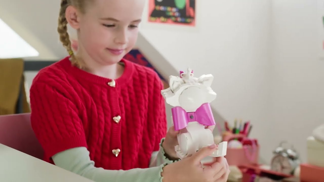The LEGO® Disney The Aristocats Adorable Marie (43286) brings kids into the world of the classic Disney movie The Aristocats, starring the elegant and playful kitten Marie. The main model is a large posable brick-built figure of Marie, with fully movable parts: the head turns, paws move, tail is flexible, and ears can tilt. Marie’s signature pink textile bow can be attached or removed from her neck, adding authenticity and allowing for outfit changes.