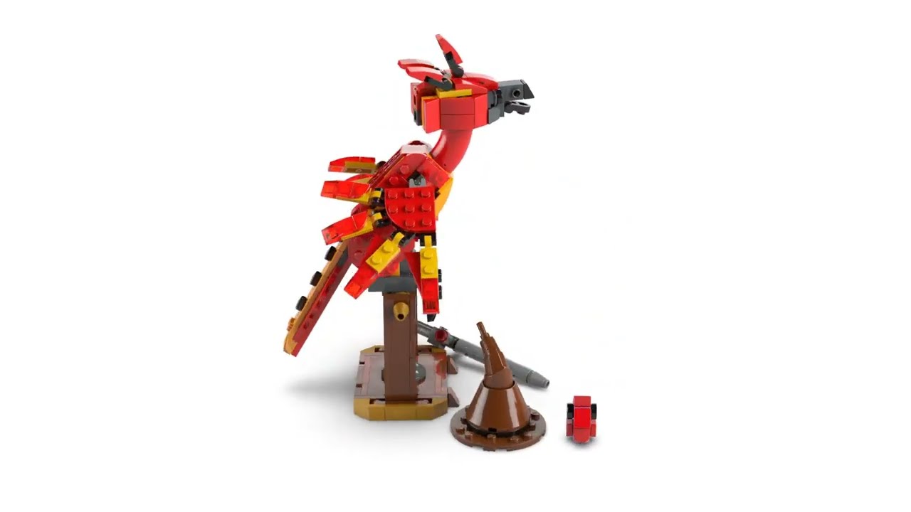 A perch with ash-like elements provides a context-rich base for display after construction. The phoenix figure can grasp a brick-built Sorting Hat and Sword of Gryffindor, enhancing interactive play scenarios.